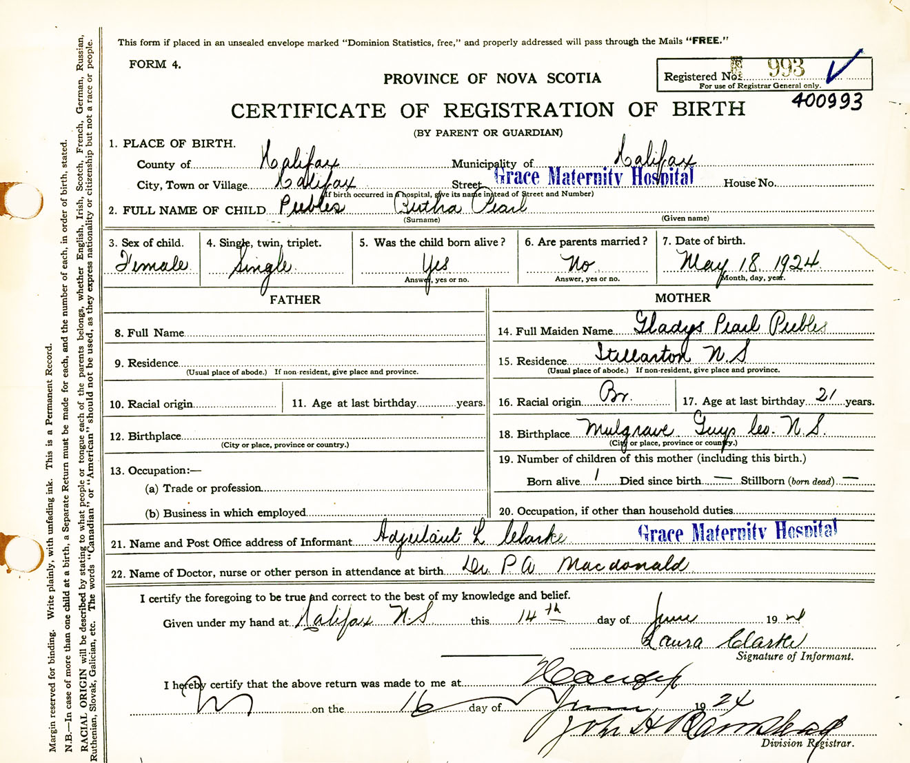 Female Birth Registration: Year: 1924 number: 40000993