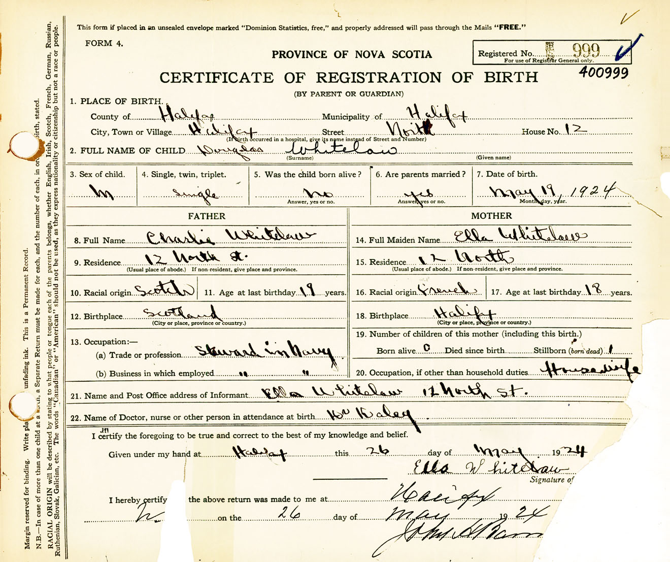 Male Birth Registration: Year: 1924 number: 40000999