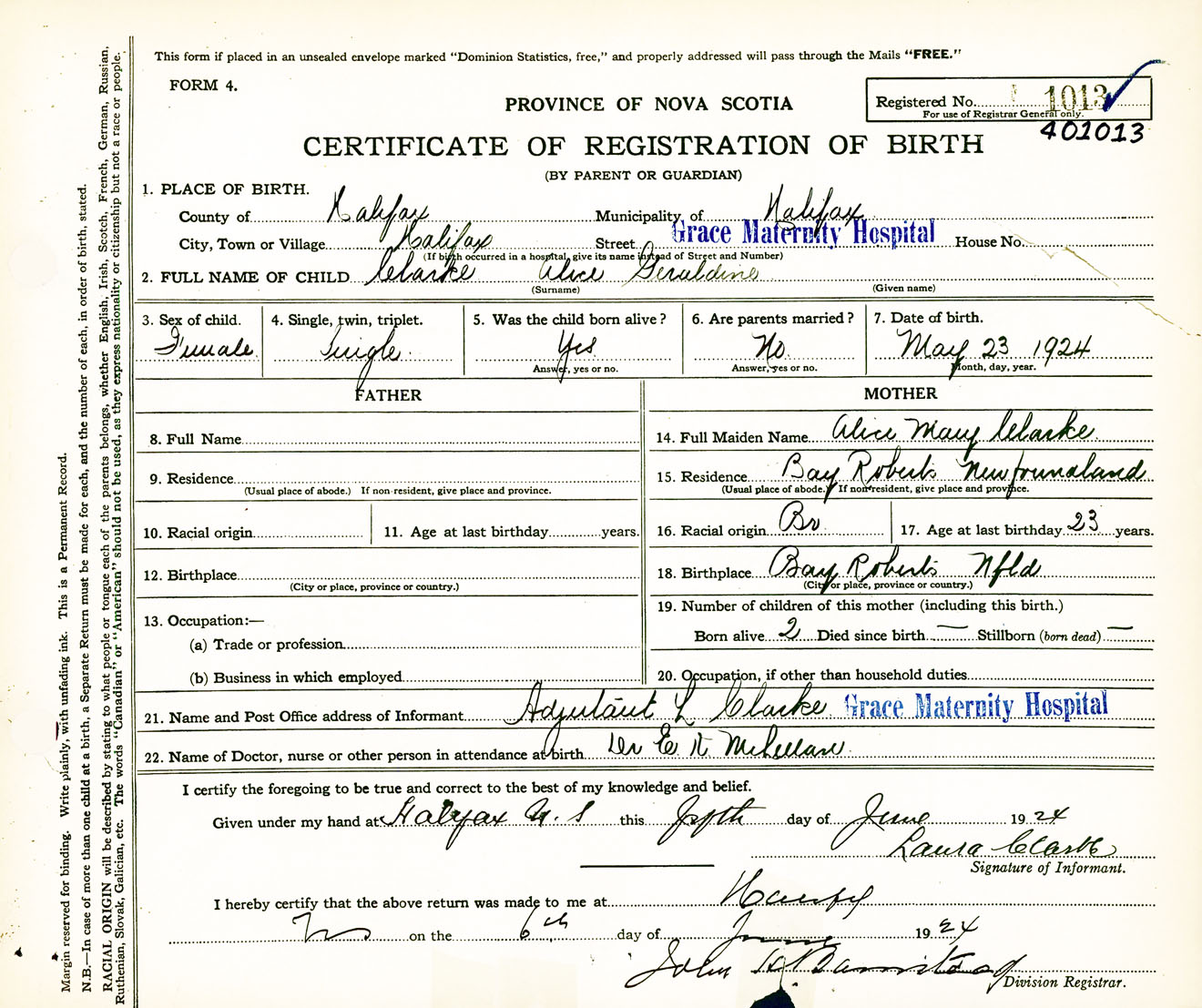 Female Birth Registration: Year: 1924 number: 40100013