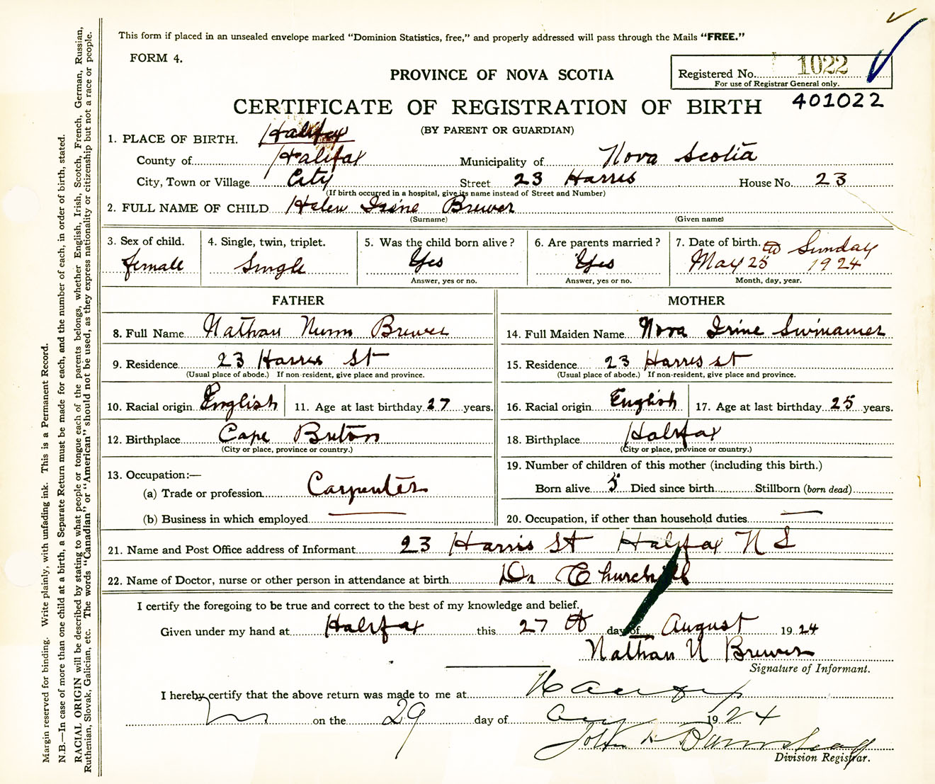 Female Birth Registration: Year: 1924 number: 40100022