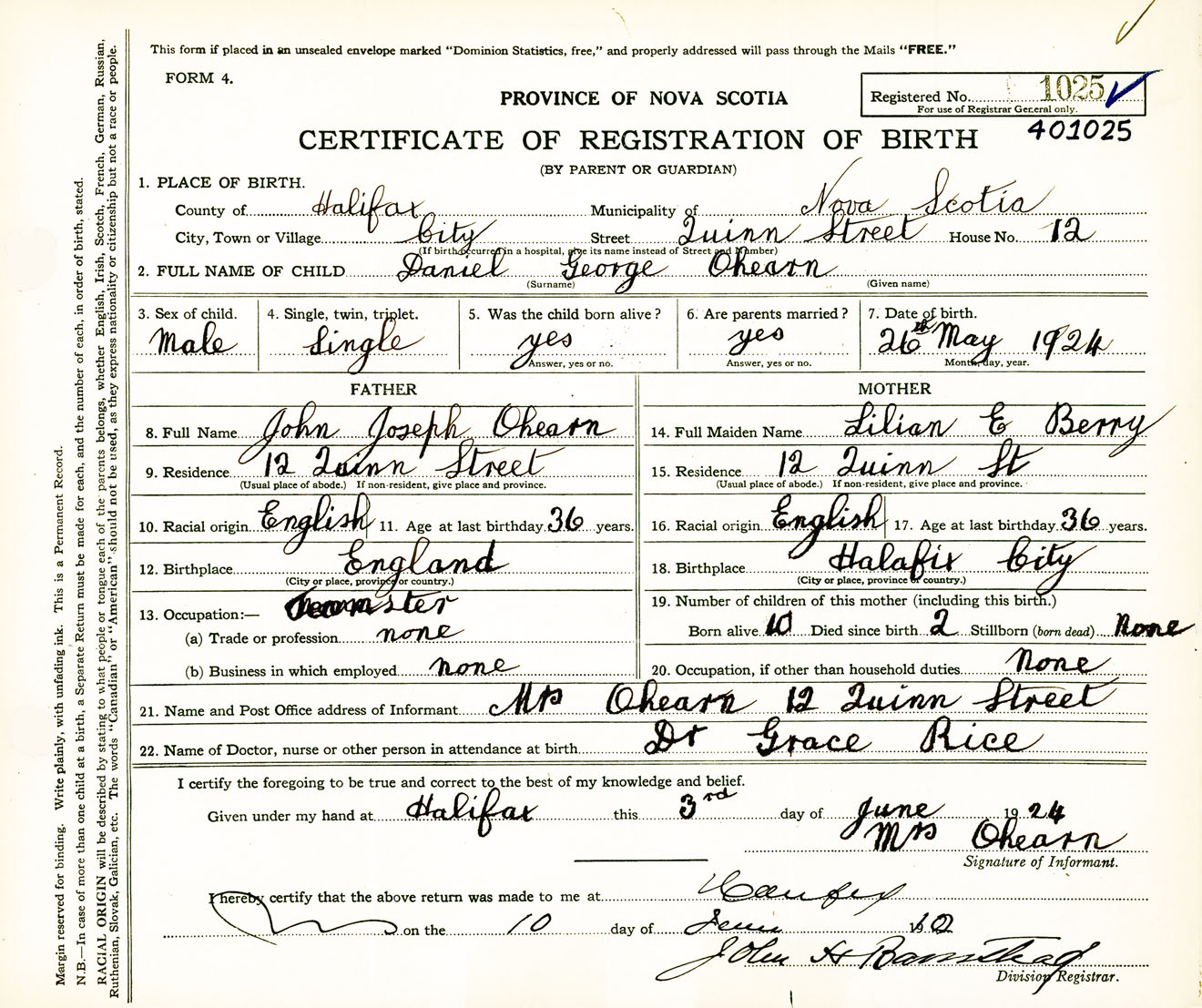 Male Birth Registration: Year: 1924 number: 40100025