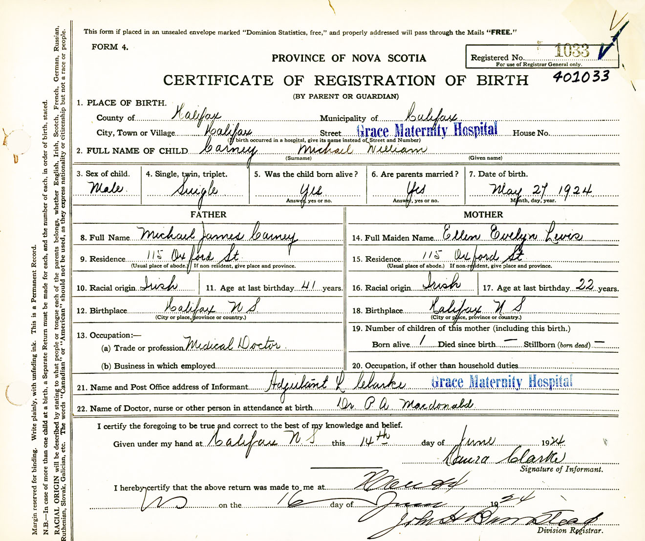 Male Birth Registration: Year: 1924 number: 40100033