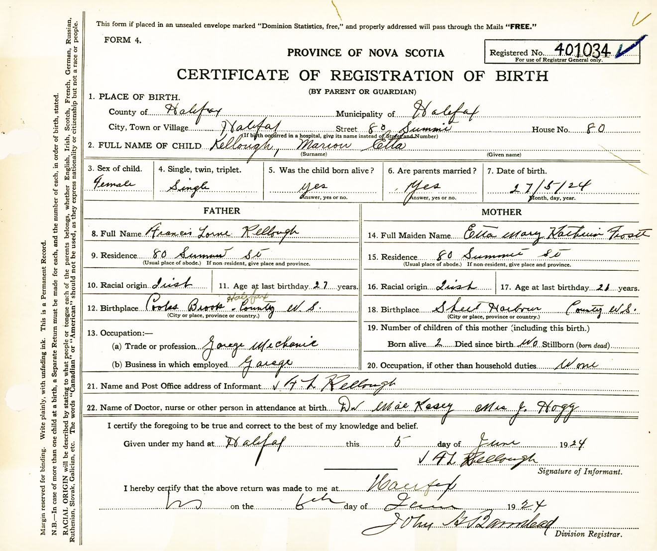 Female Birth Registration: Year: 1924 number: 40100034