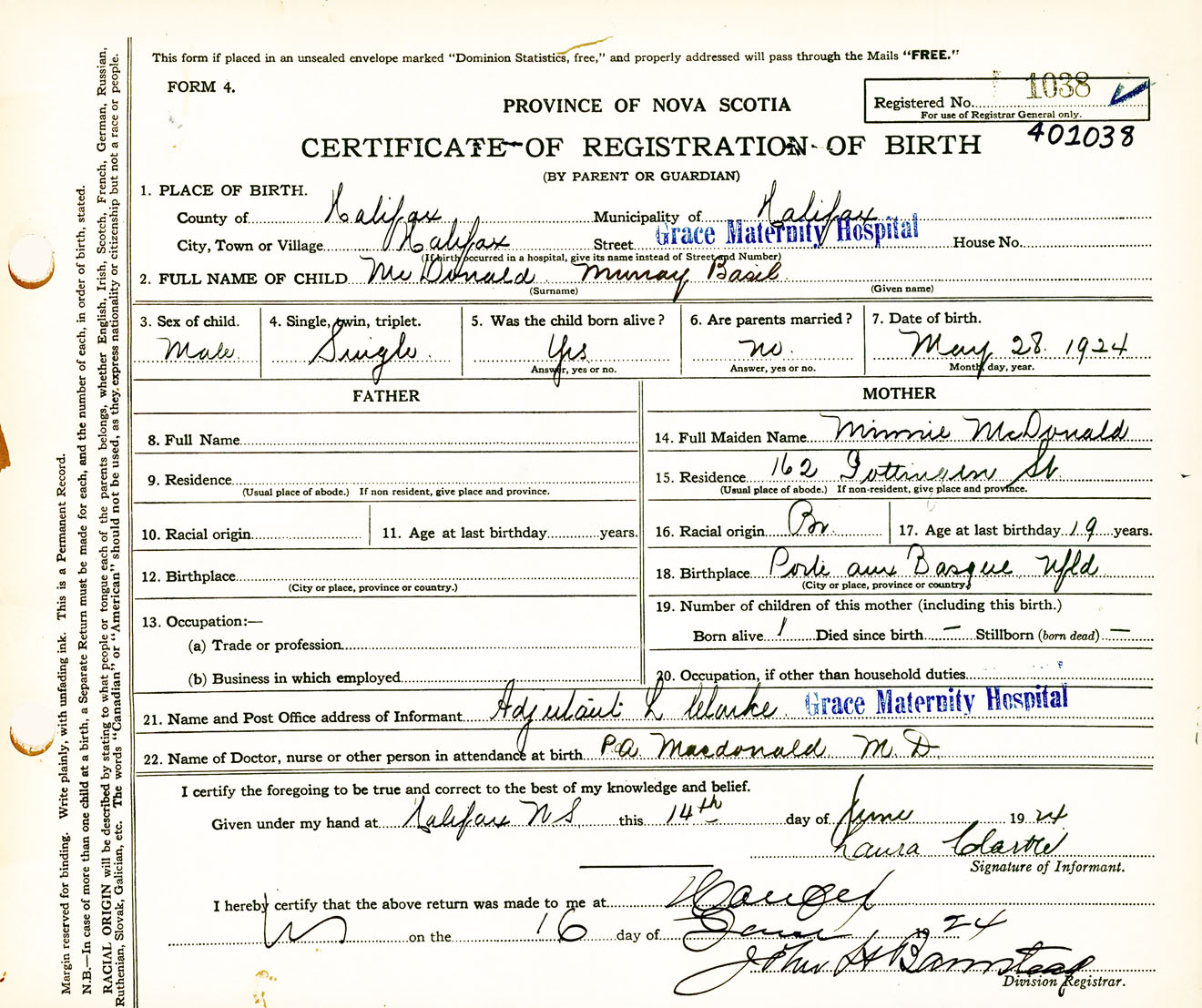 Male Birth Registration: Year: 1924 number: 40100038