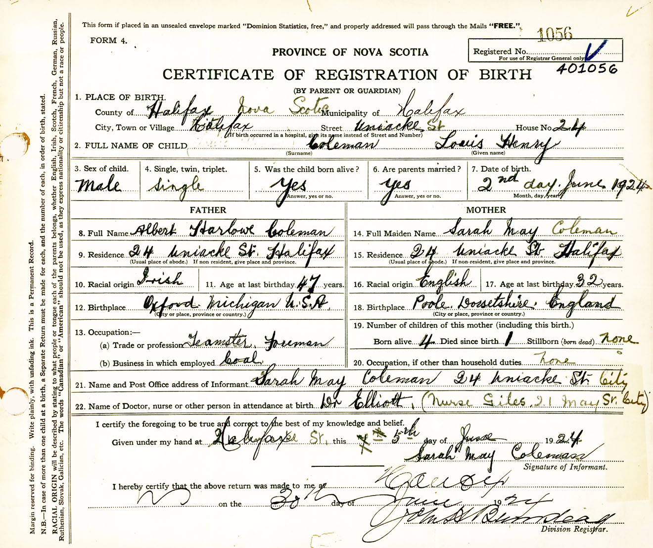 Male Birth Registration: Year: 1924 number: 40100056