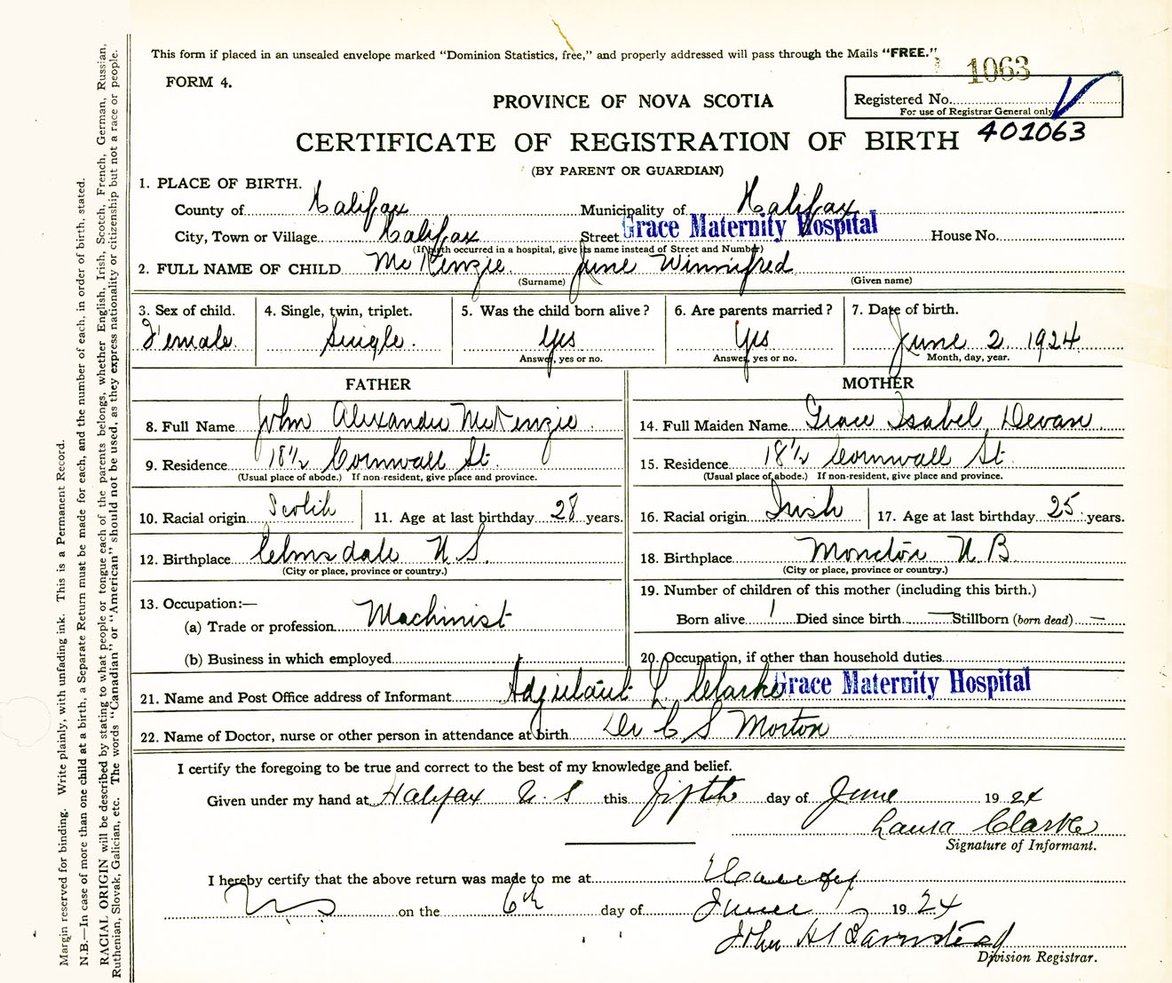Female Birth Registration: Year: 1924 number: 40100063