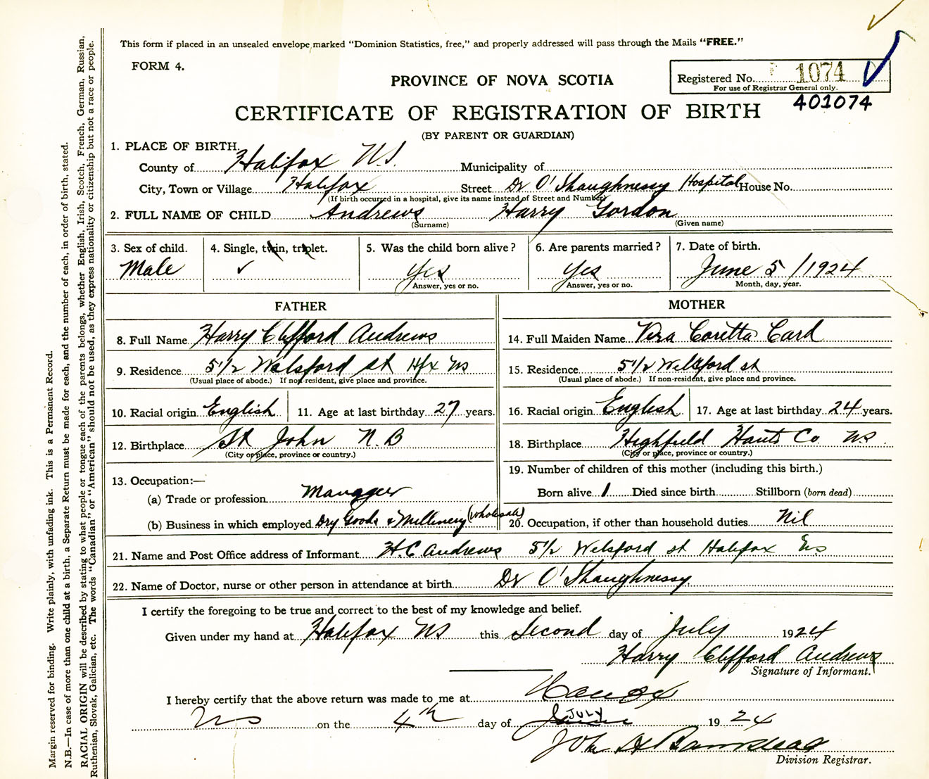 Male Birth Registration: Year: 1924 number: 40100074