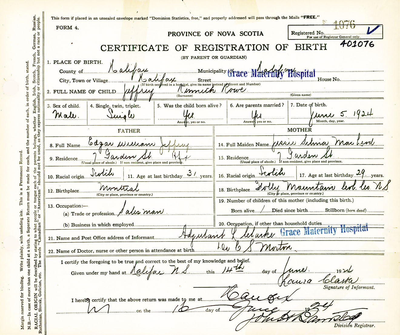 Male Birth Registration: Year: 1924 number: 40100076