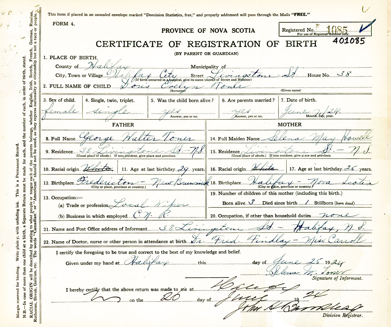 Female Birth Registration: Year: 1924 number: 40100085