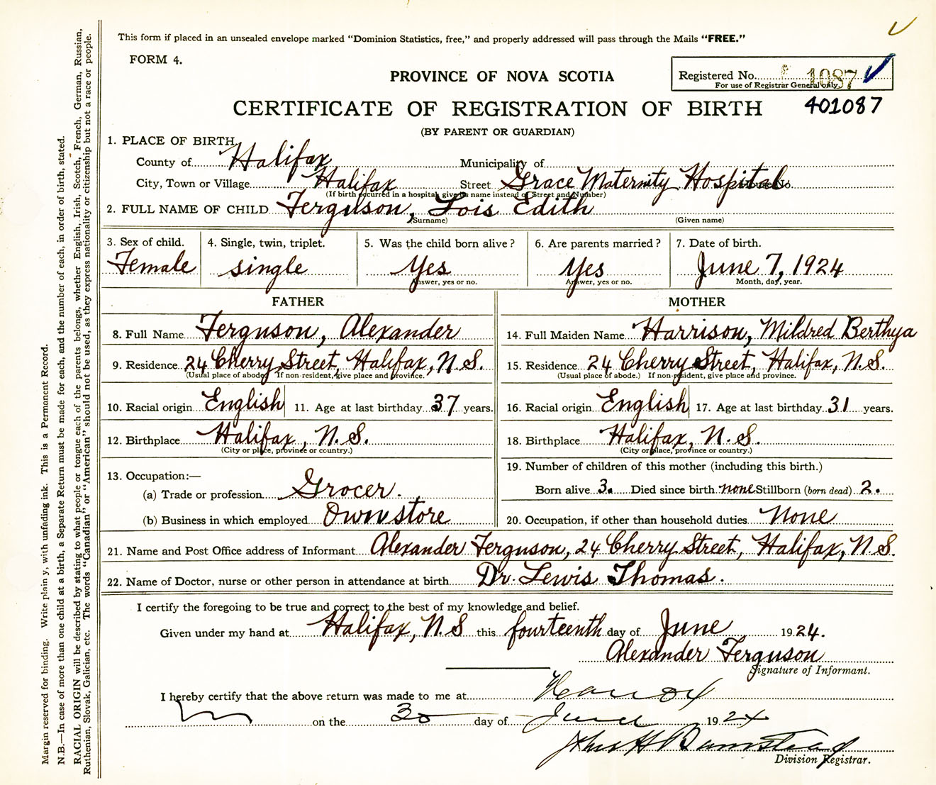 Female Birth Registration: Year: 1924 number: 40100087