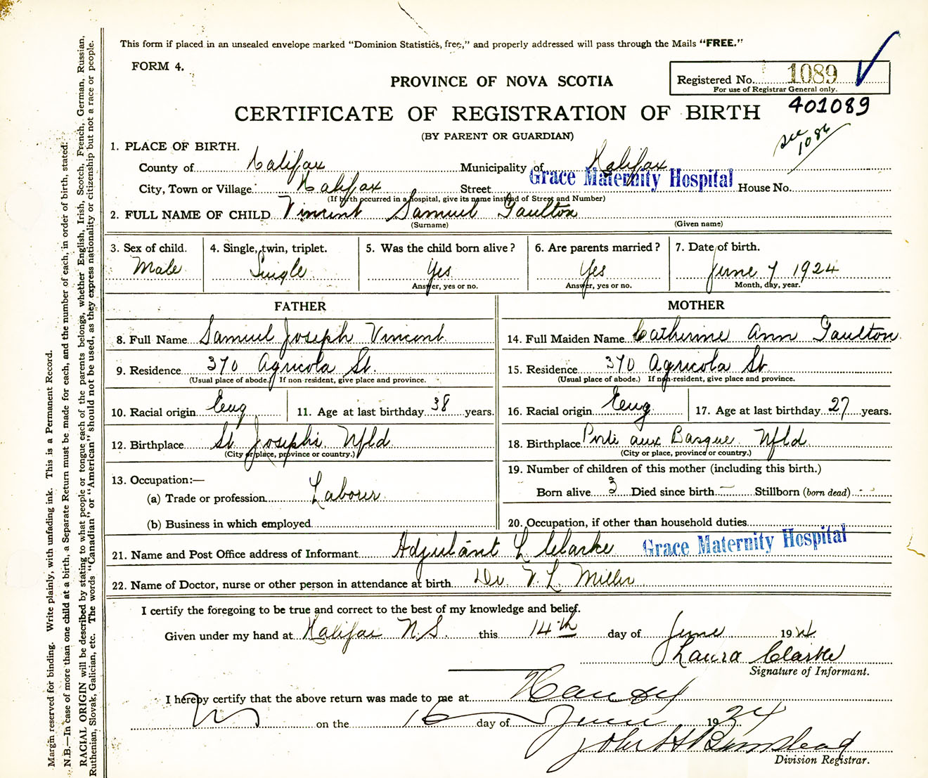 Male Birth Registration: Year: 1924 number: 40100089