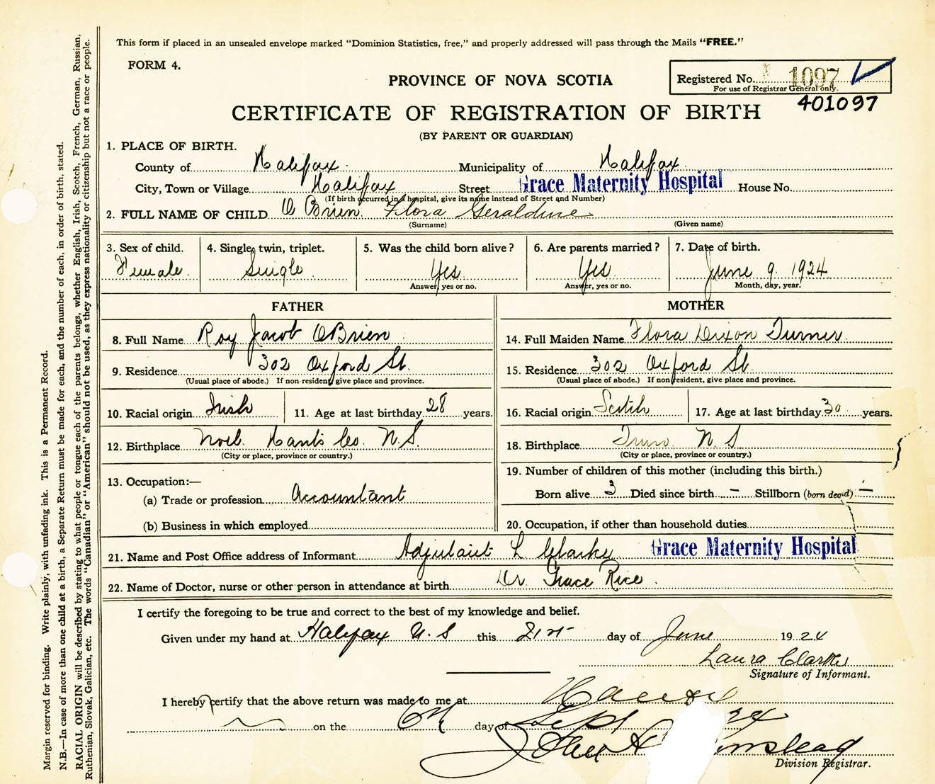 Female Birth Registration: Year: 1924 number: 40100097