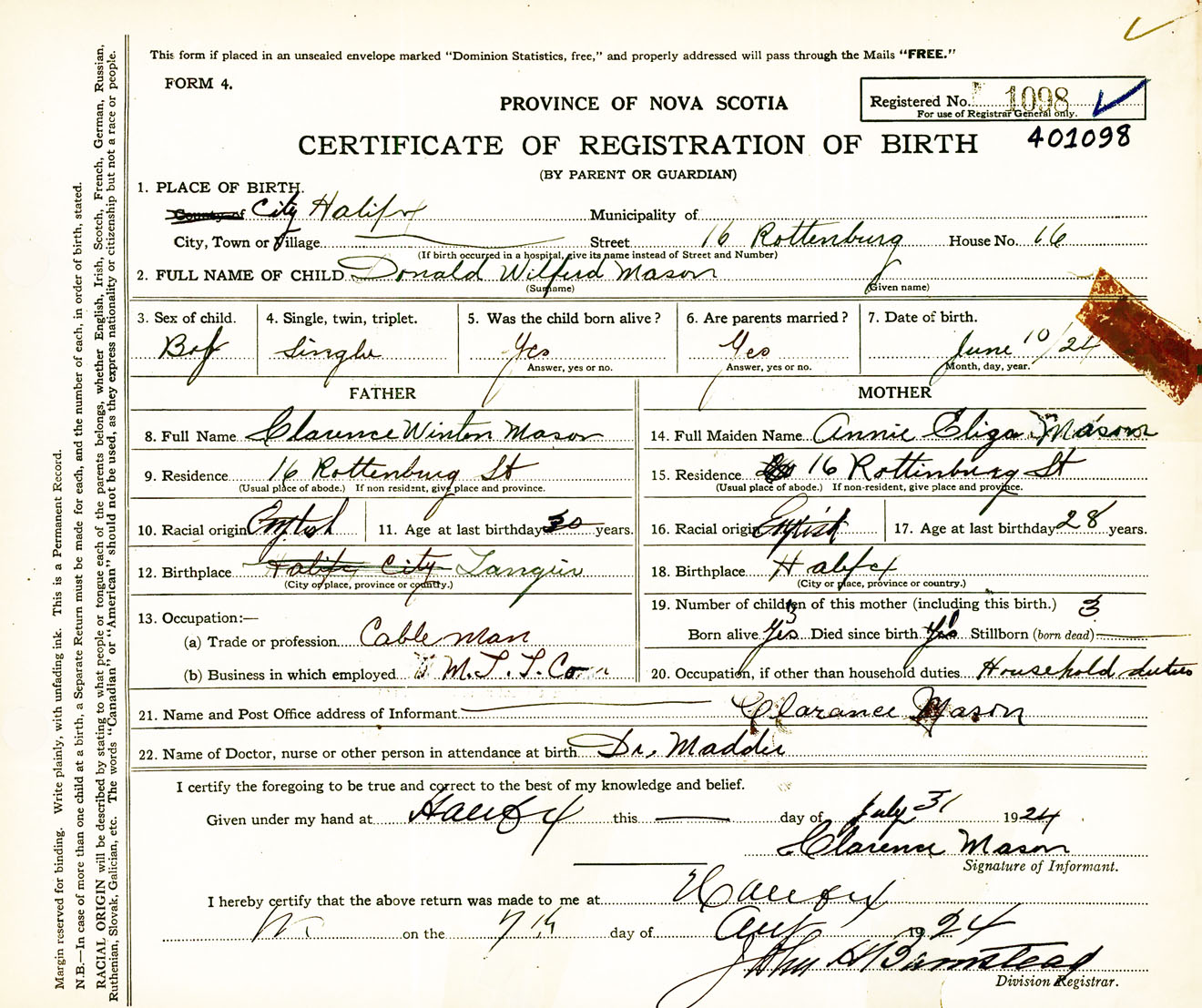 Male Birth Registration: Year: 1924 number: 40100098