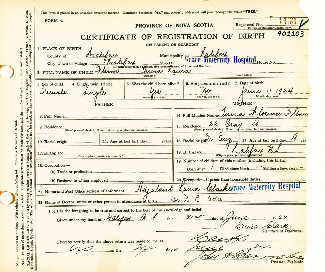 Female Birth Registration: Year: 1924 number: 40100103