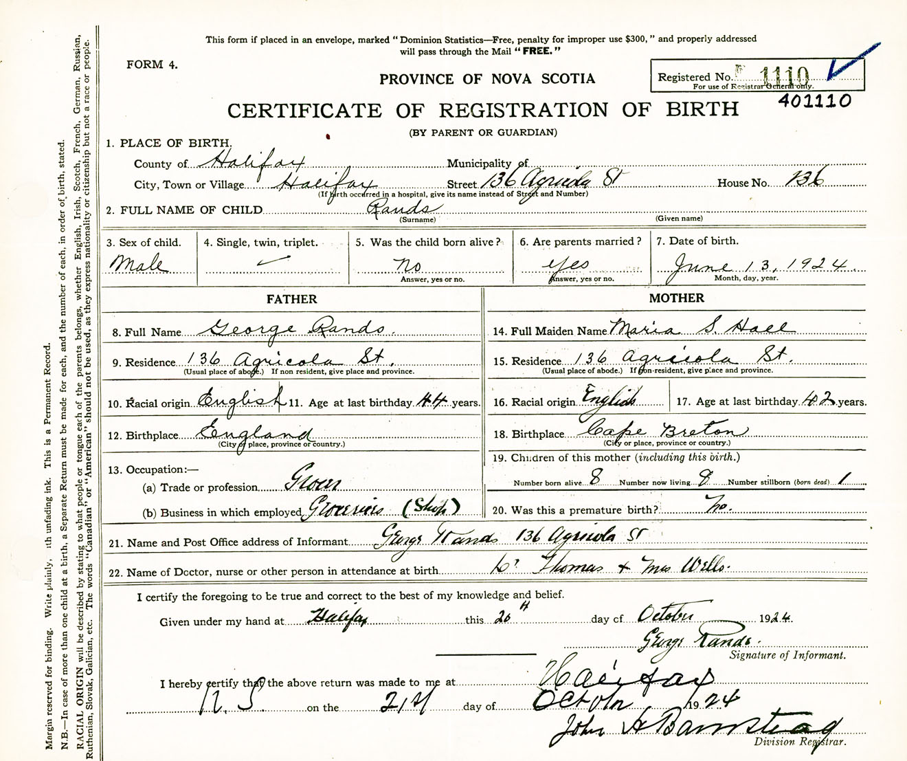 Male Birth Registration: Year: 1924 number: 40100110