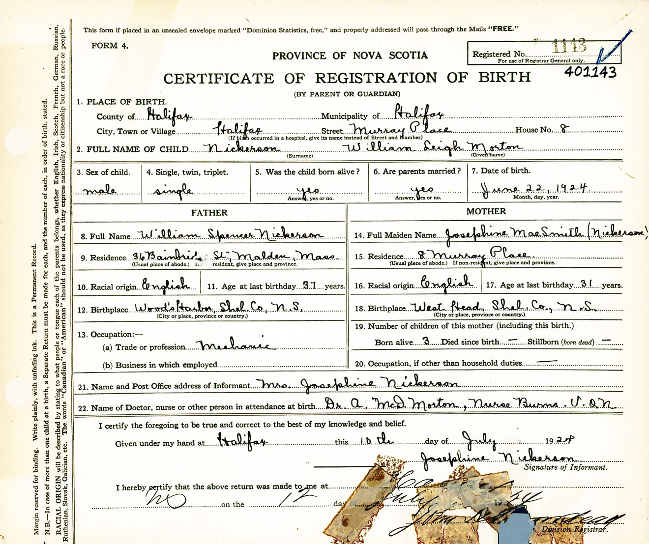 Male Birth Registration: Year: 1924 number: 40100143