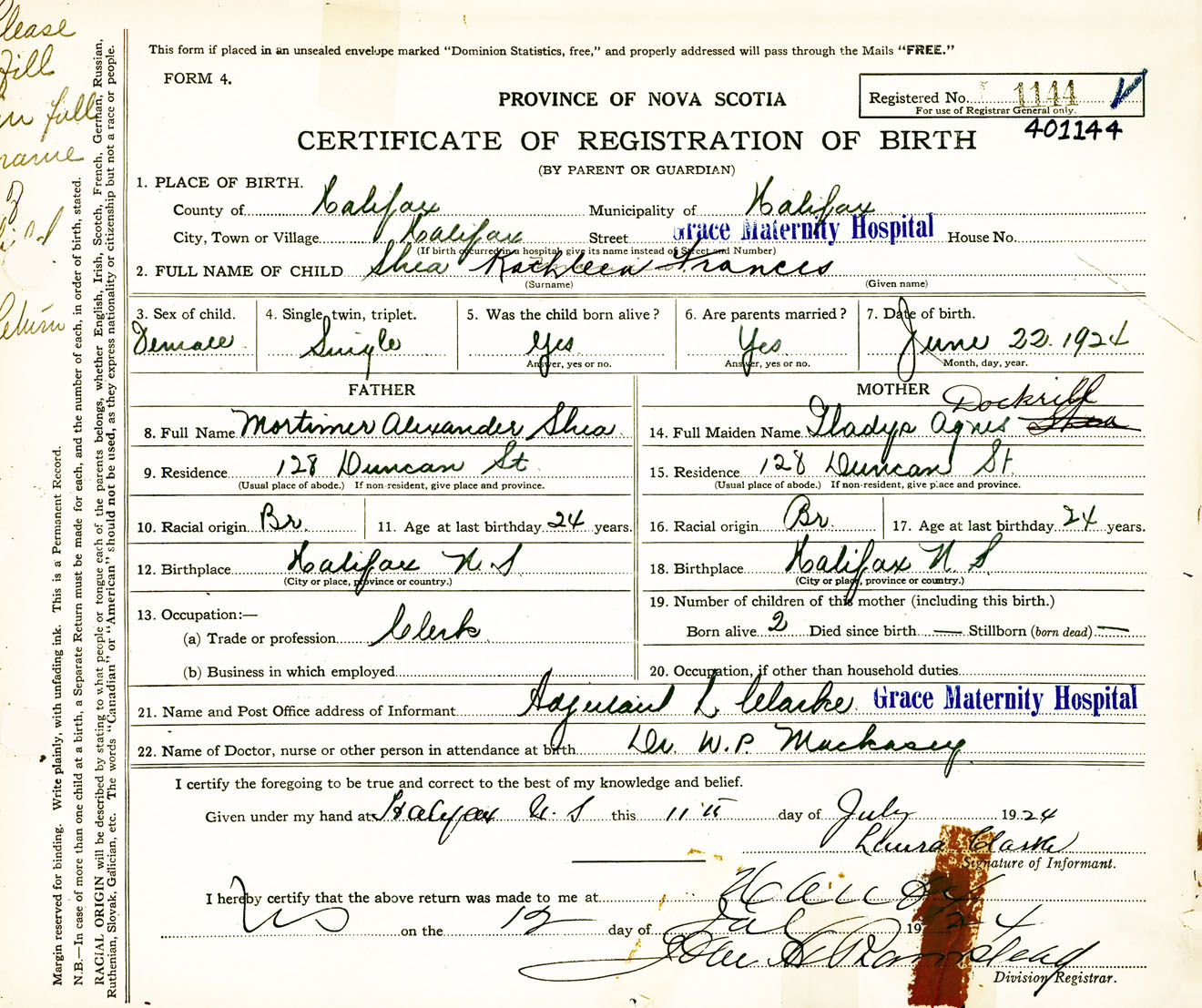 Female Birth Registration: Year: 1924 number: 40100144