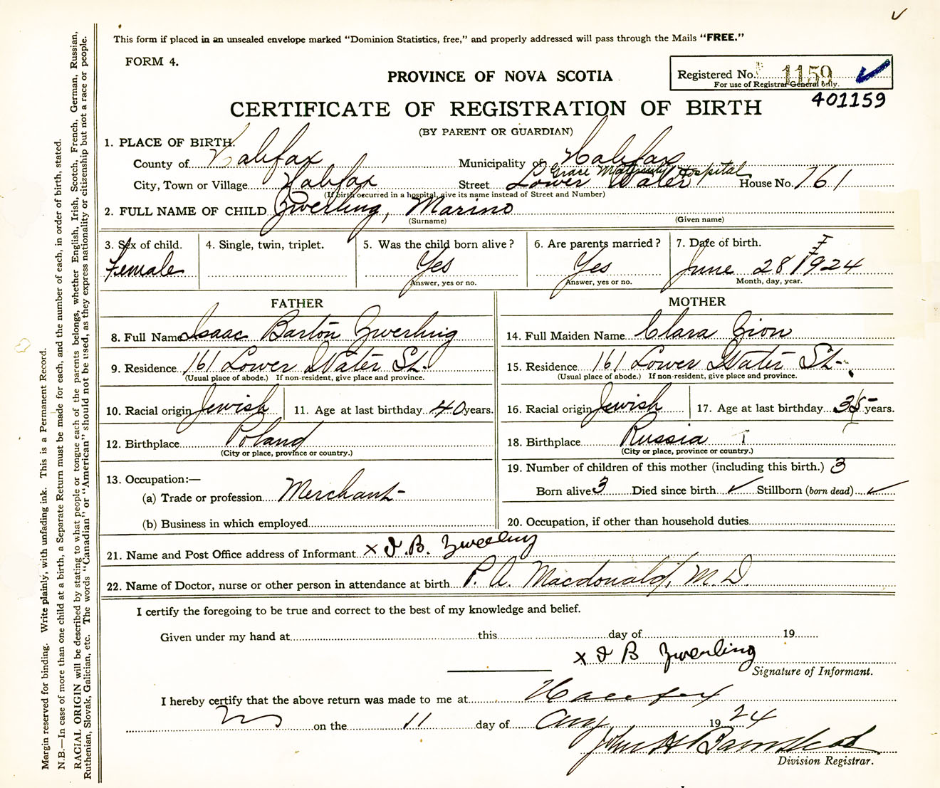 Female Birth Registration: Year: 1924 number: 40100159