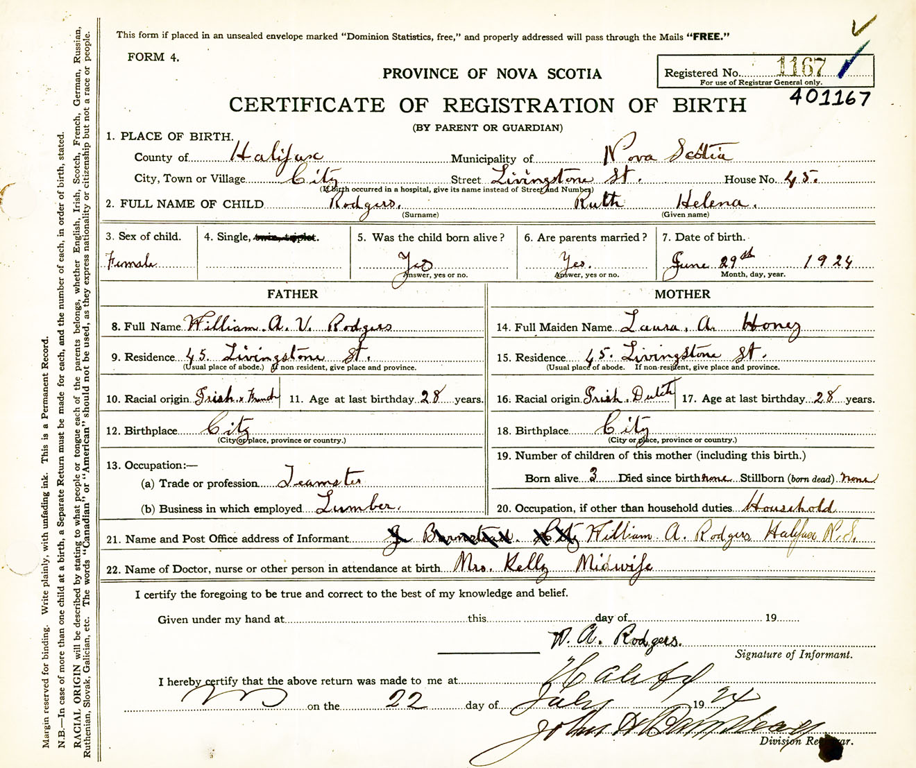 Female Birth Registration: Year: 1924 number: 40100167