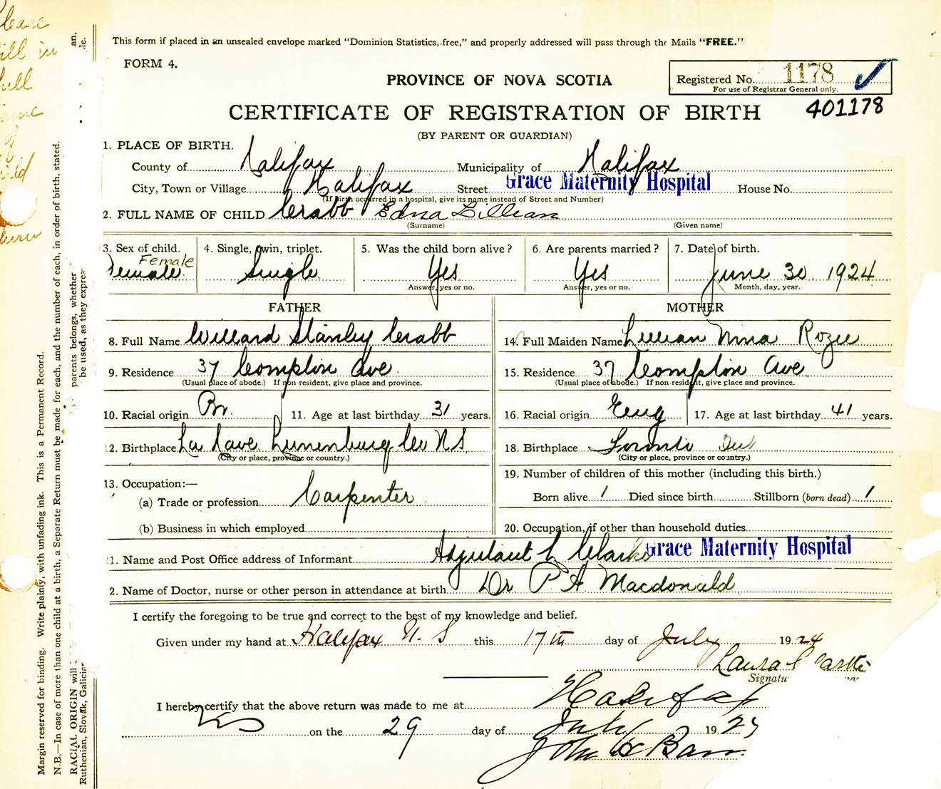 Female Birth Registration: Year: 1924 number: 40100178