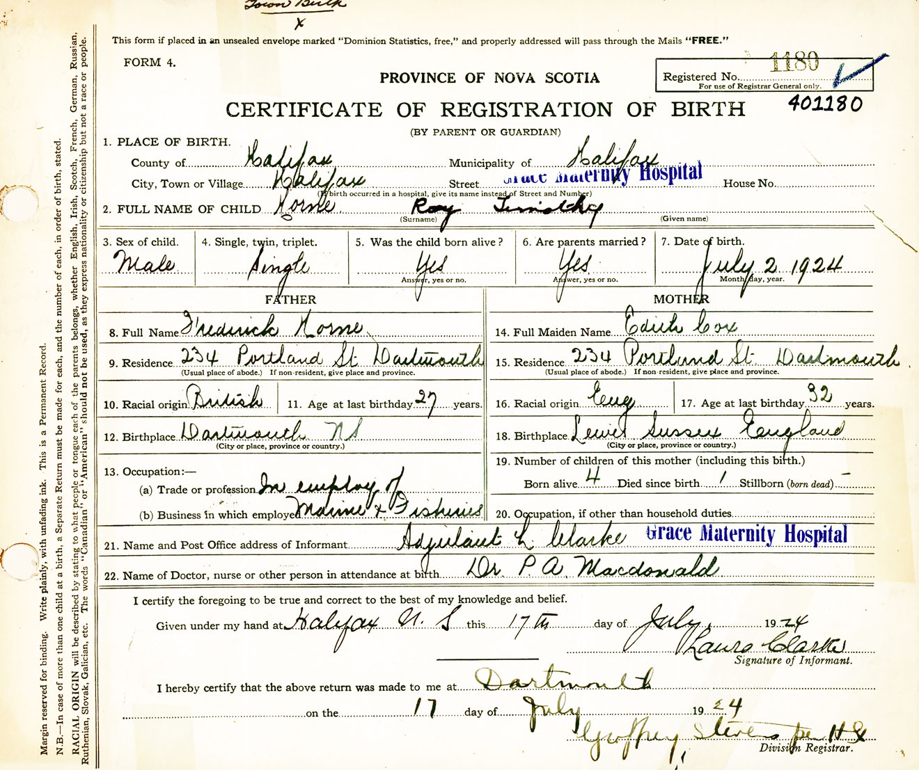 Male Birth Registration: Year: 1924 number: 40100180