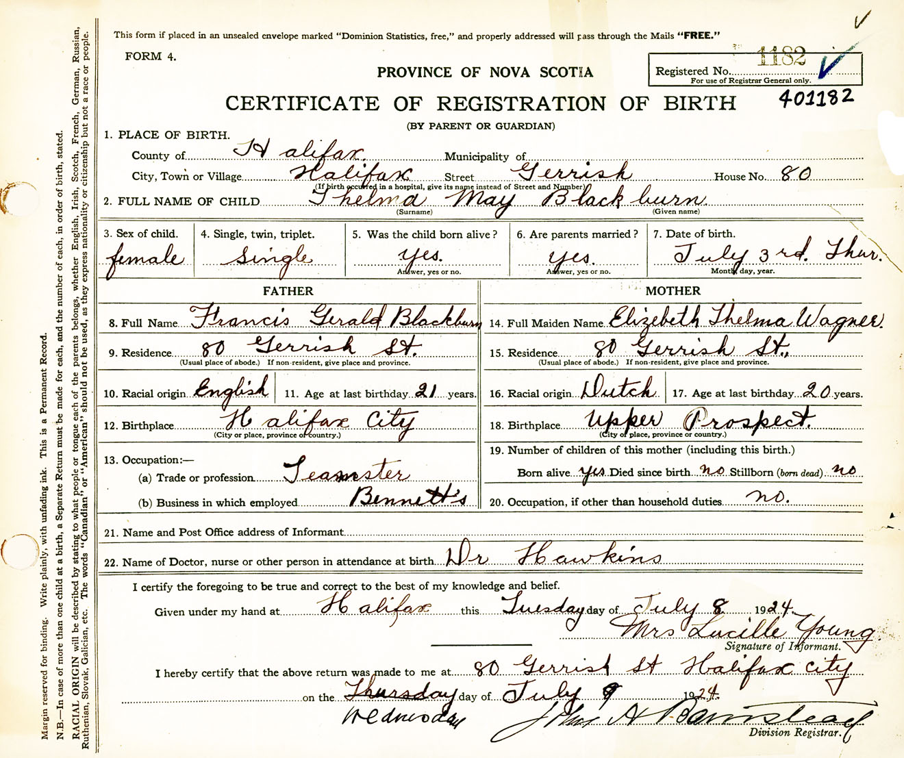 Female Birth Registration: Year: 1924 number: 40100182