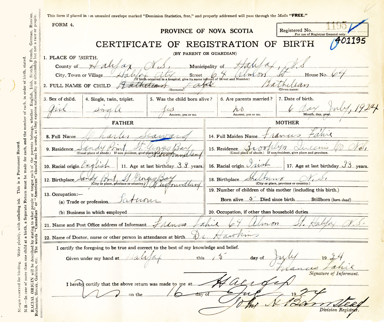 Female Birth Registration: Year: 1924 number: 40100195