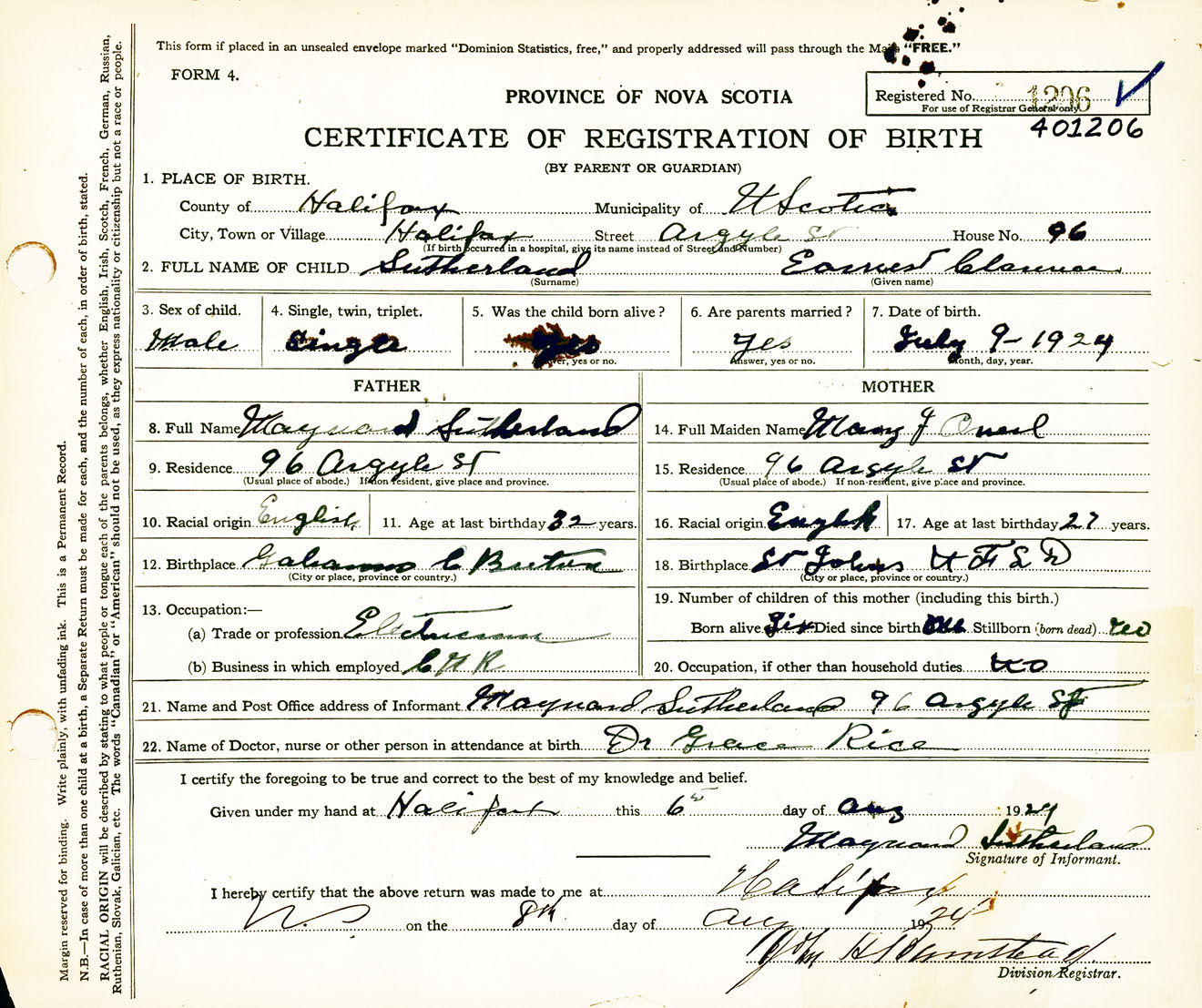 Male Birth Registration: Year: 1924 number: 40100206