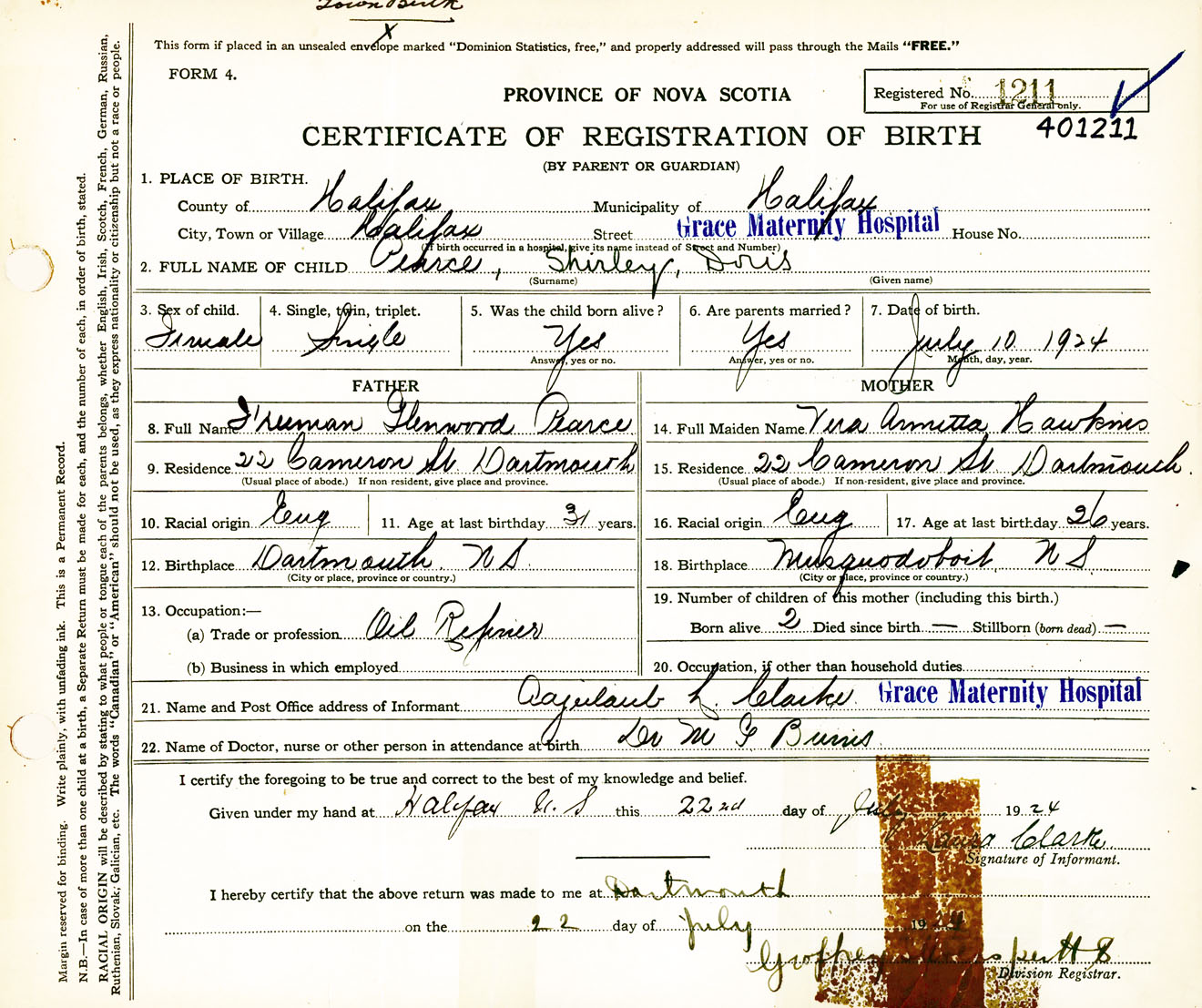 Female Birth Registration: Year: 1924 number: 40100211