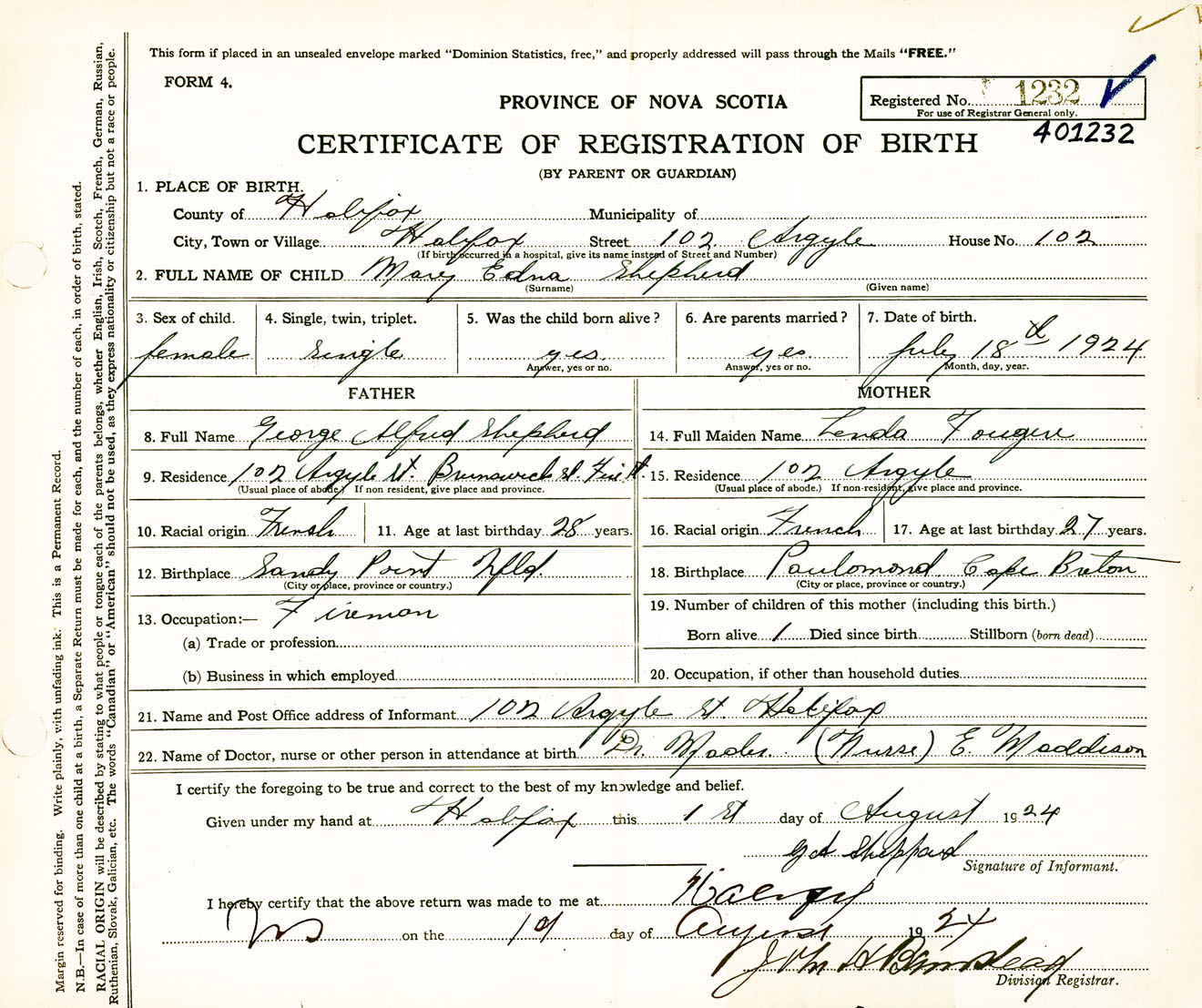 Female Birth Registration: Year: 1924 number: 40100232