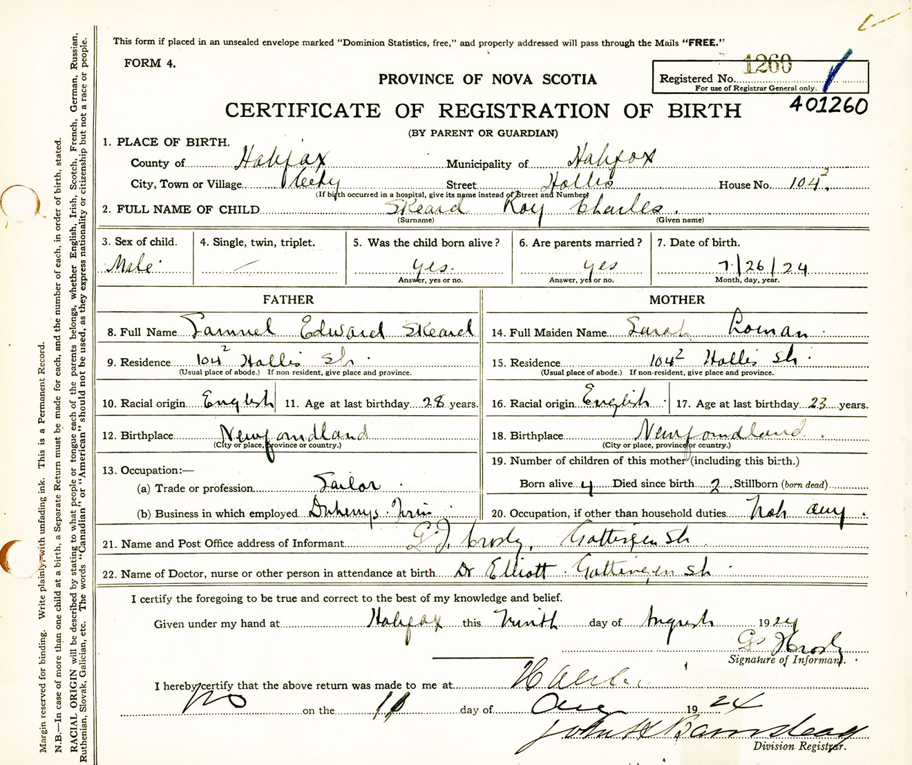 Male Birth Registration: Year: 1924 number: 40100260