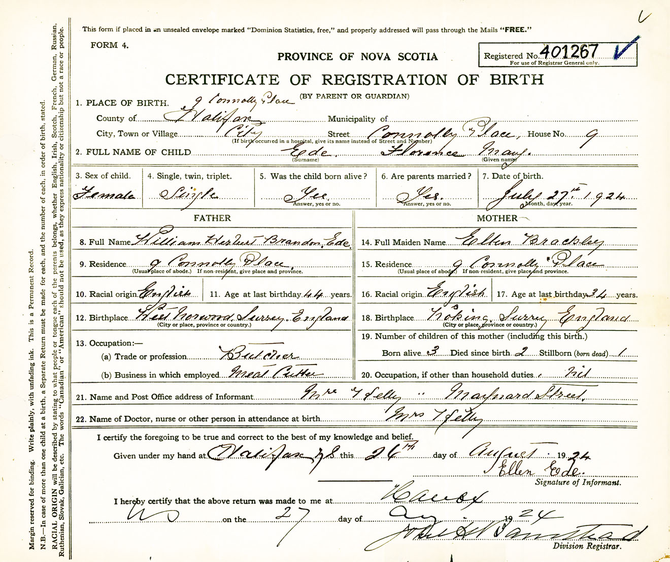 Female Birth Registration: Year: 1924 number: 40100267