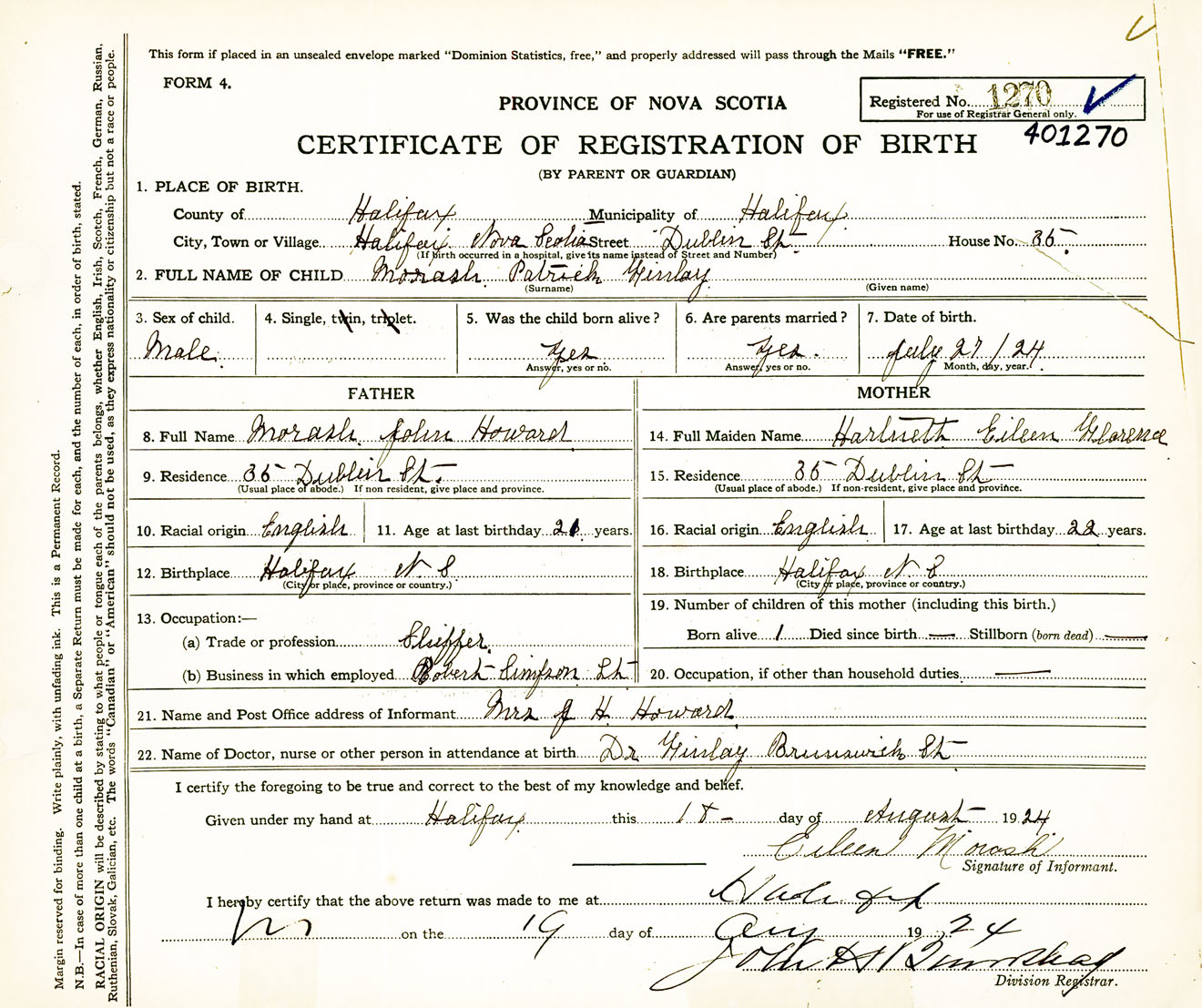 Male Birth Registration: Year: 1924 number: 40100270