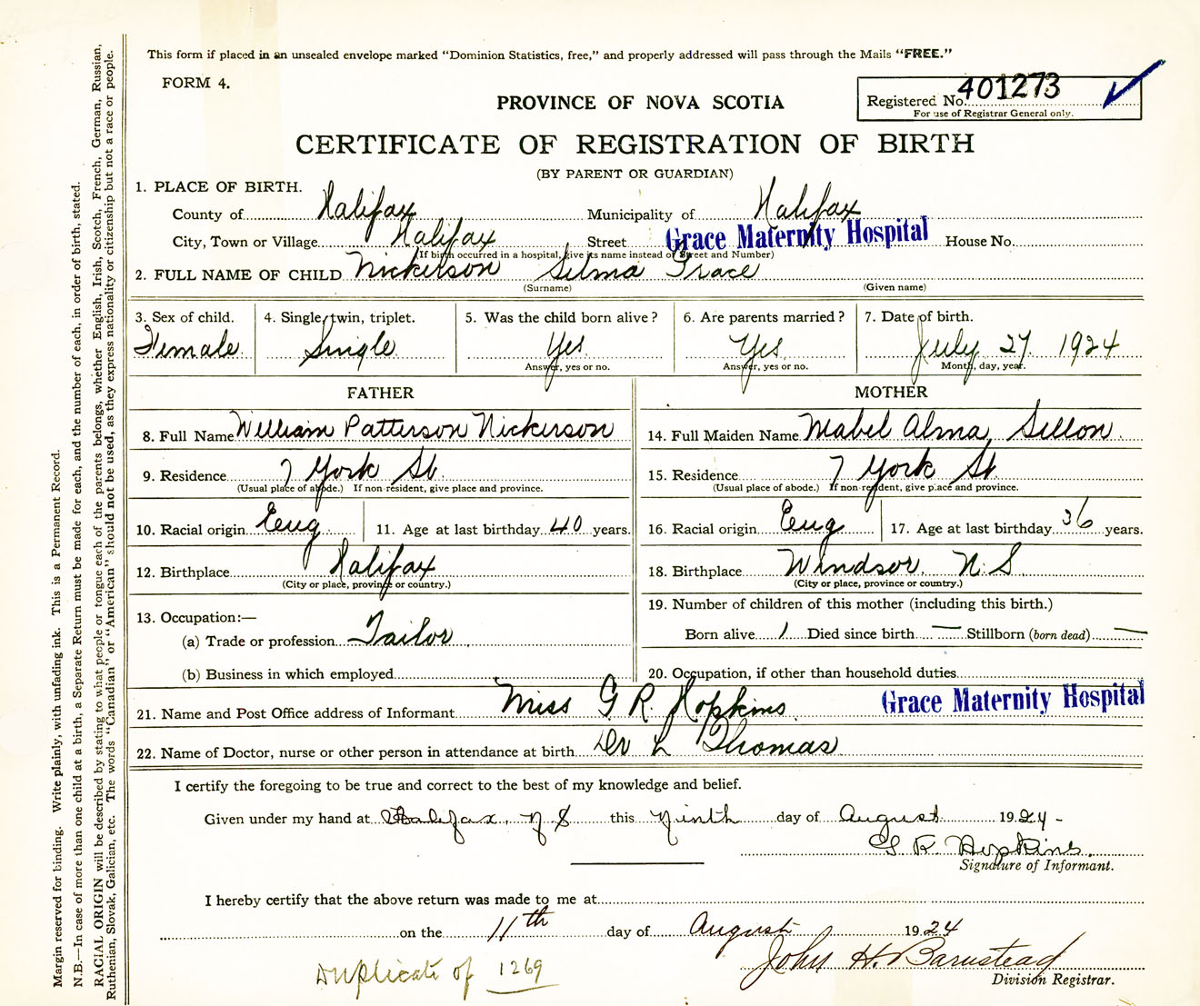 Female Birth Registration: Year: 1924 number: 40100273