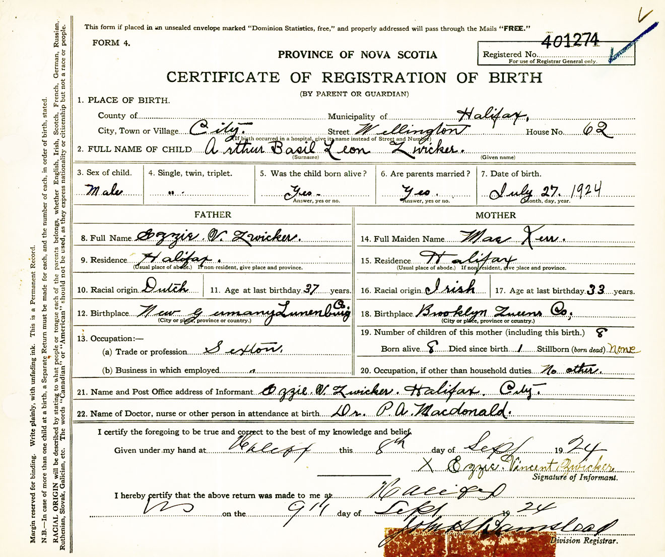 Male Birth Registration: Year: 1924 number: 40100274