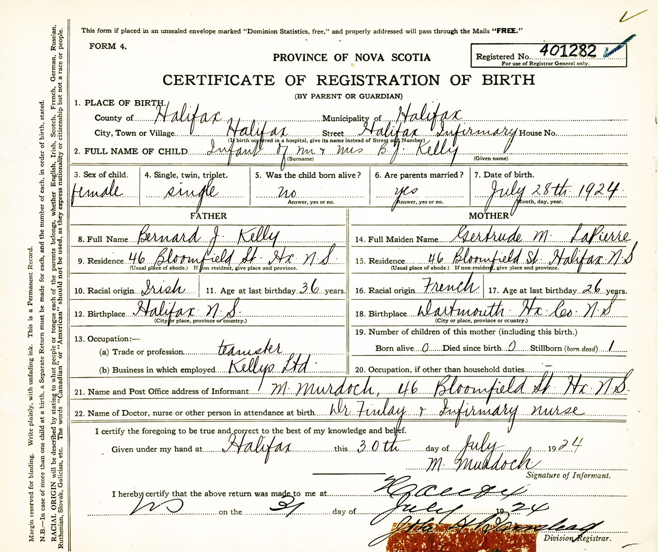 Female Birth Registration: Year: 1924 number: 40100282