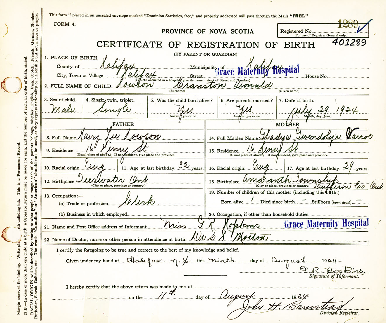 Male Birth Registration: Year: 1924 number: 40100289