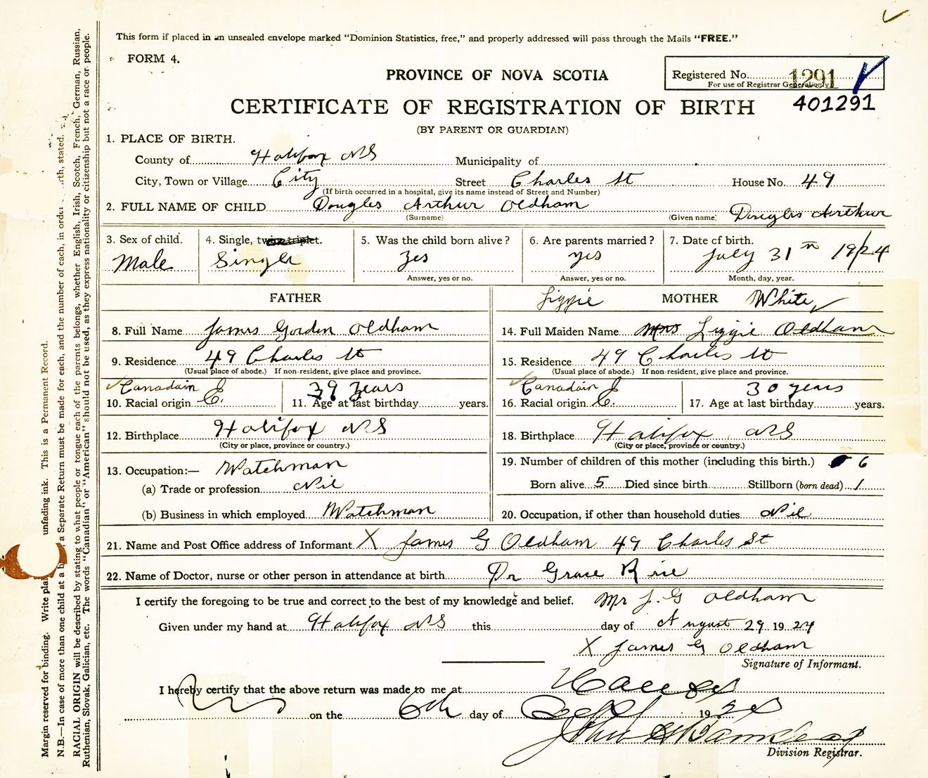 Male Birth Registration: Year: 1924 number: 40100291
