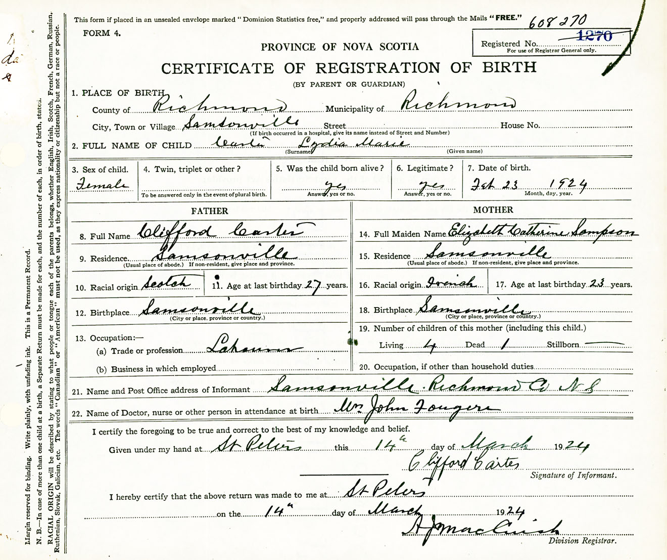 Female Birth Registration: Year: 1924 number: 60800270