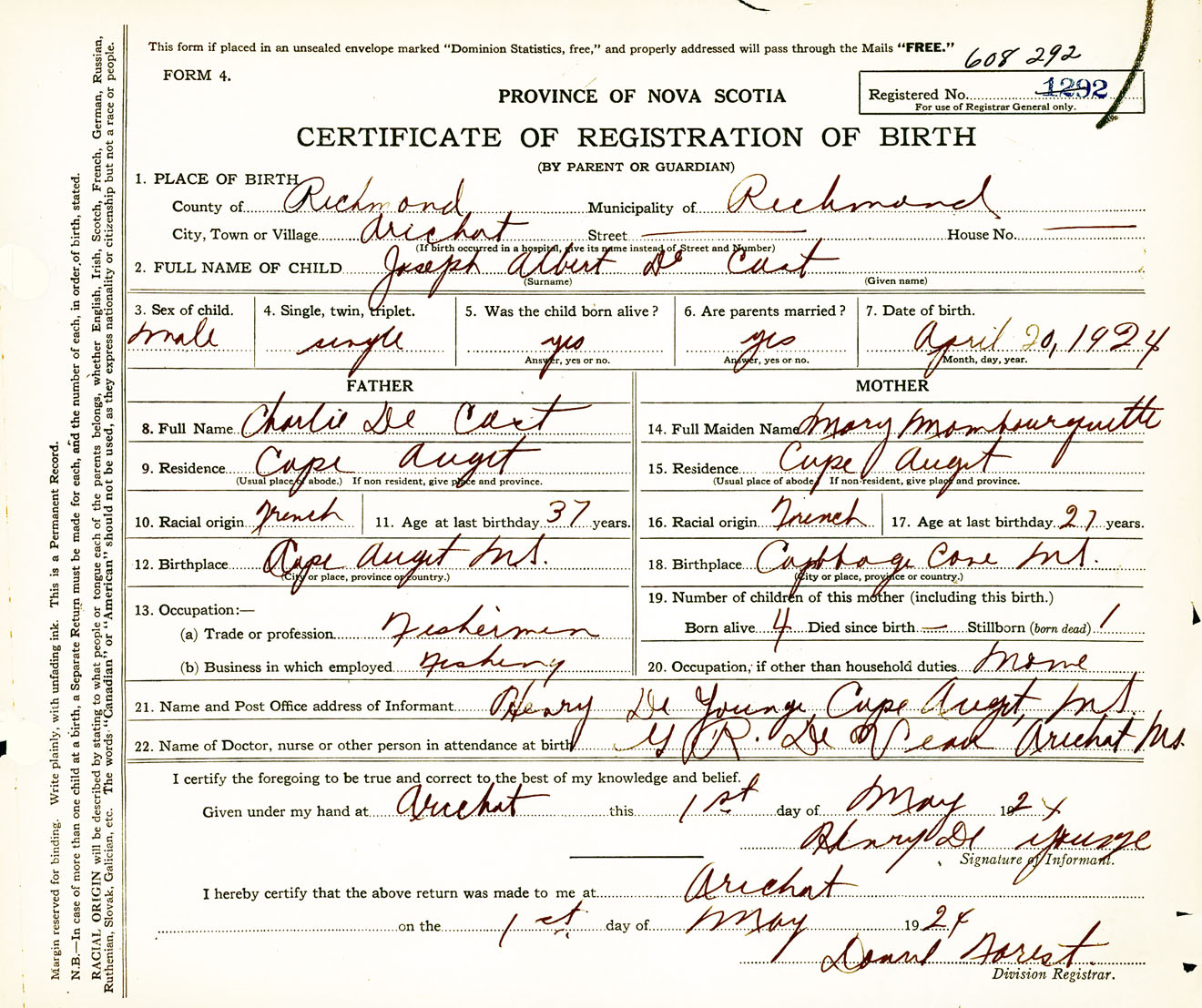 Male Birth Registration: Year: 1924 number: 60800292