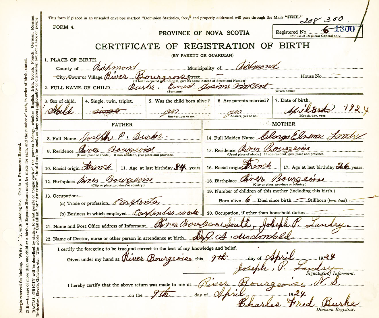 Male Birth Registration: Year: 1924 number: 60800300