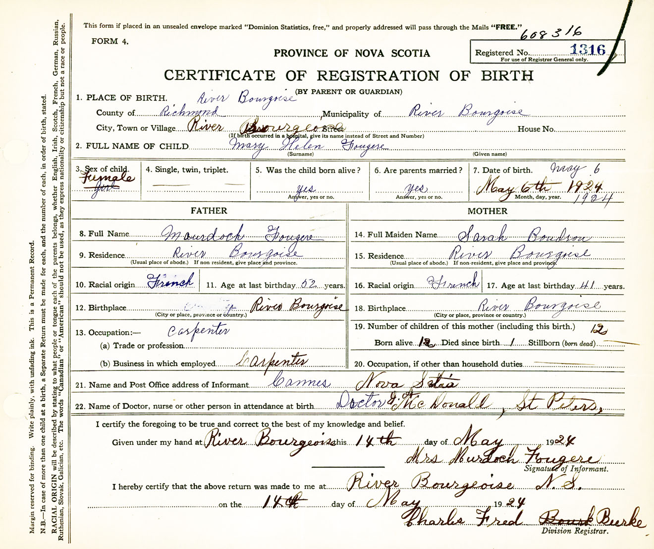 Female Birth Registration: Year: 1924 number: 60800316