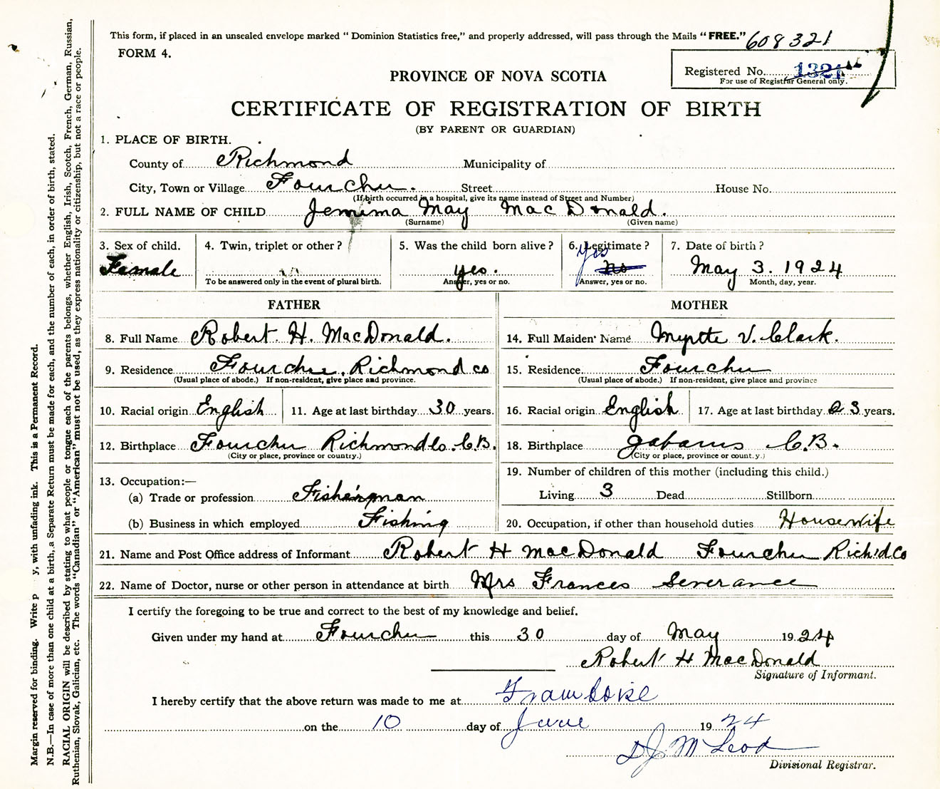 Female Birth Registration: Year: 1924 number: 60800321
