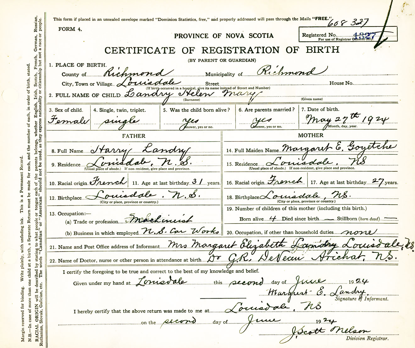 Female Birth Registration: Year: 1924 number: 60800327