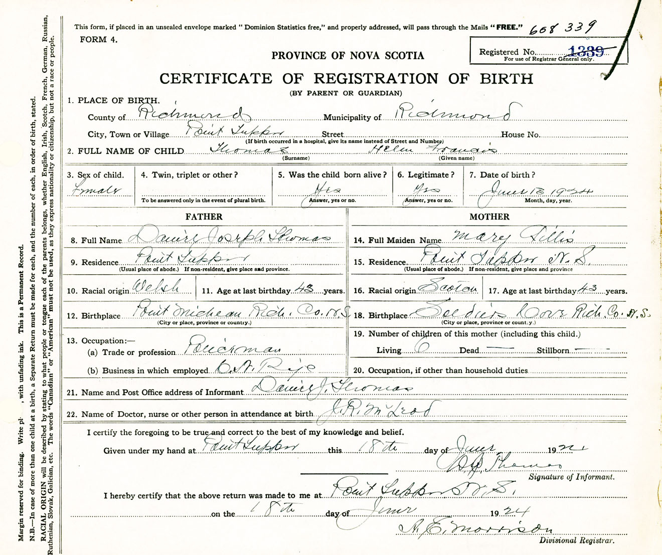 Female Birth Registration: Year: 1924 number: 60800339