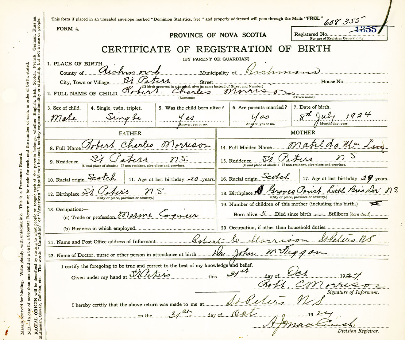 Male Birth Registration: Year: 1924 number: 60800355