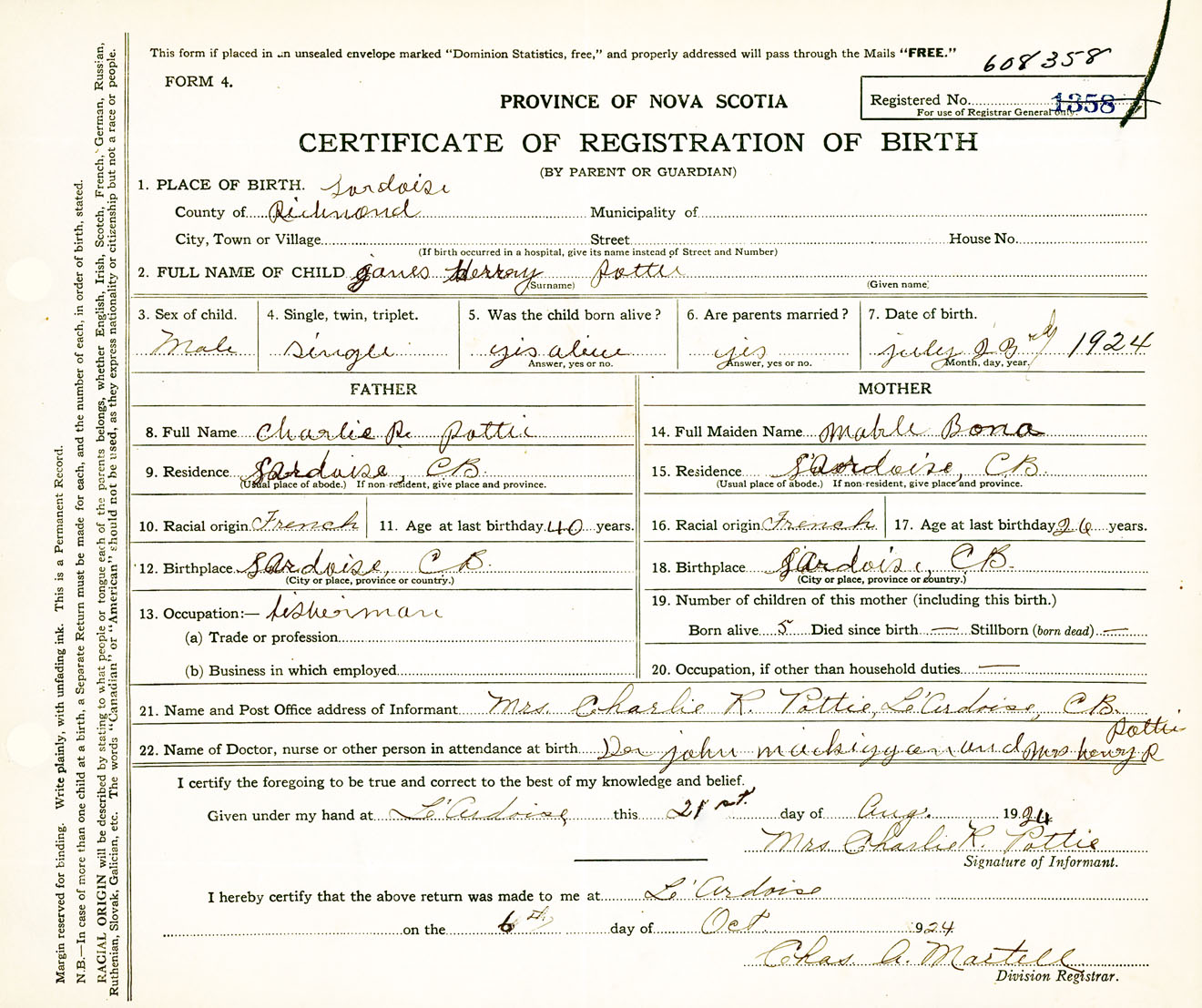 Male Birth Registration: Year: 1924 number: 60800358