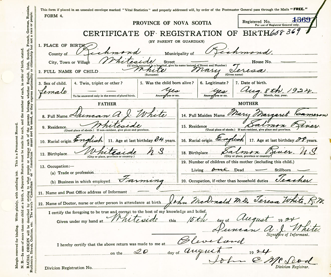Female Birth Registration: Year: 1924 number: 60800369