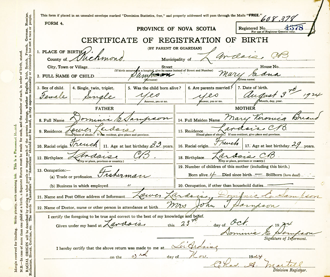Female Birth Registration: Year: 1924 number: 60800378
