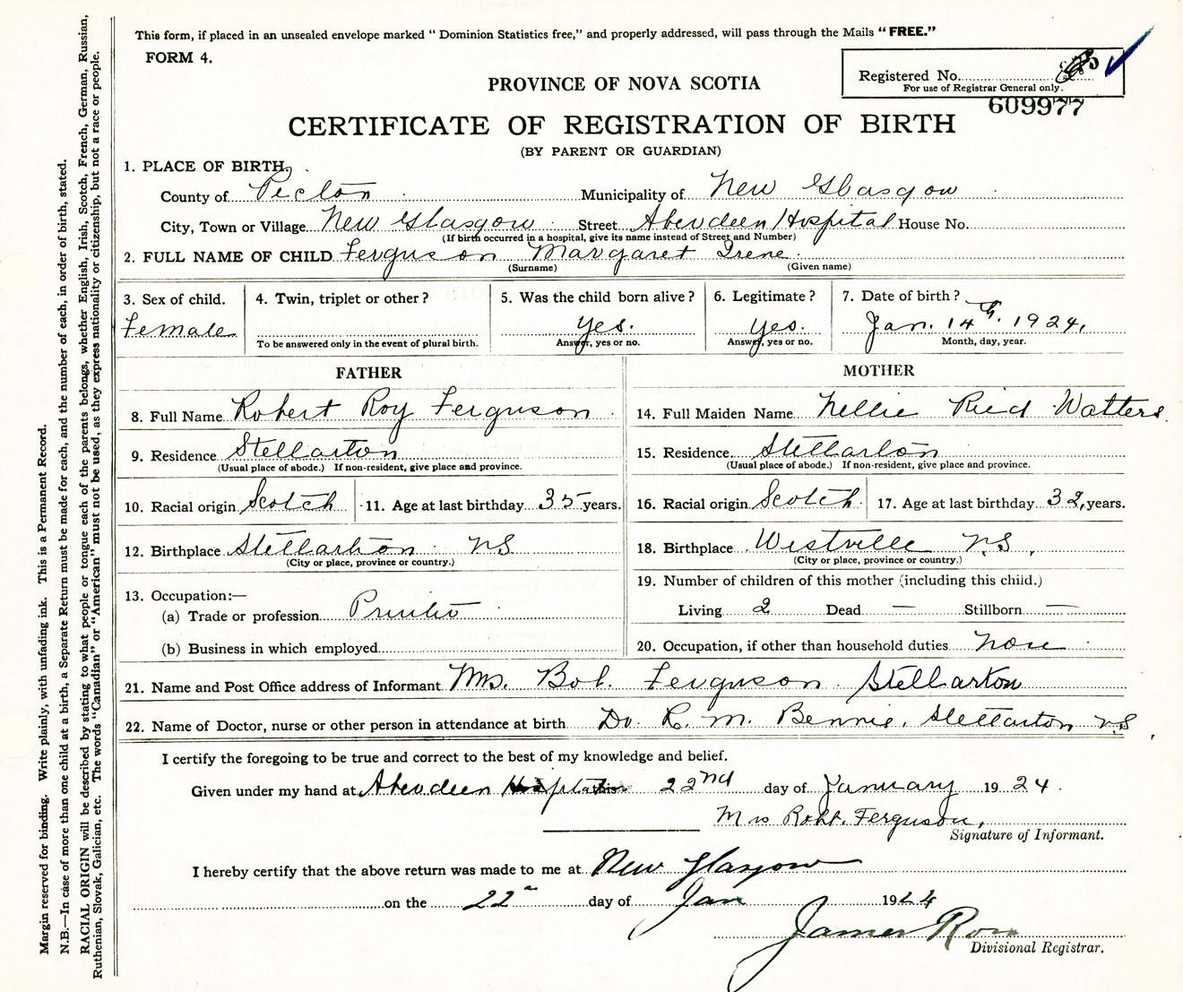 Female Birth Registration: Year: 1924 number: 60900977